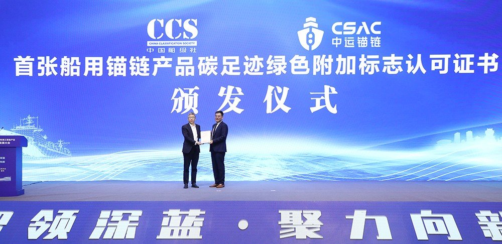 3月20日,第四届高技术船舶和海工装备产业技术创新发展大会在泰州顺利召开。会上,中国船级社(CCS)江苏分社副总经理黄林生向中运锚链(江苏)有限公司董事长赵绍德颁发了CCS首张船用锚链产品碳足迹绿色附加标志认可证书。这一里程碑不仅标志着公司在绿色制造领域迈出关键一步,也彰显了中运锚链在全球产业链中的责任担当与领先地位。